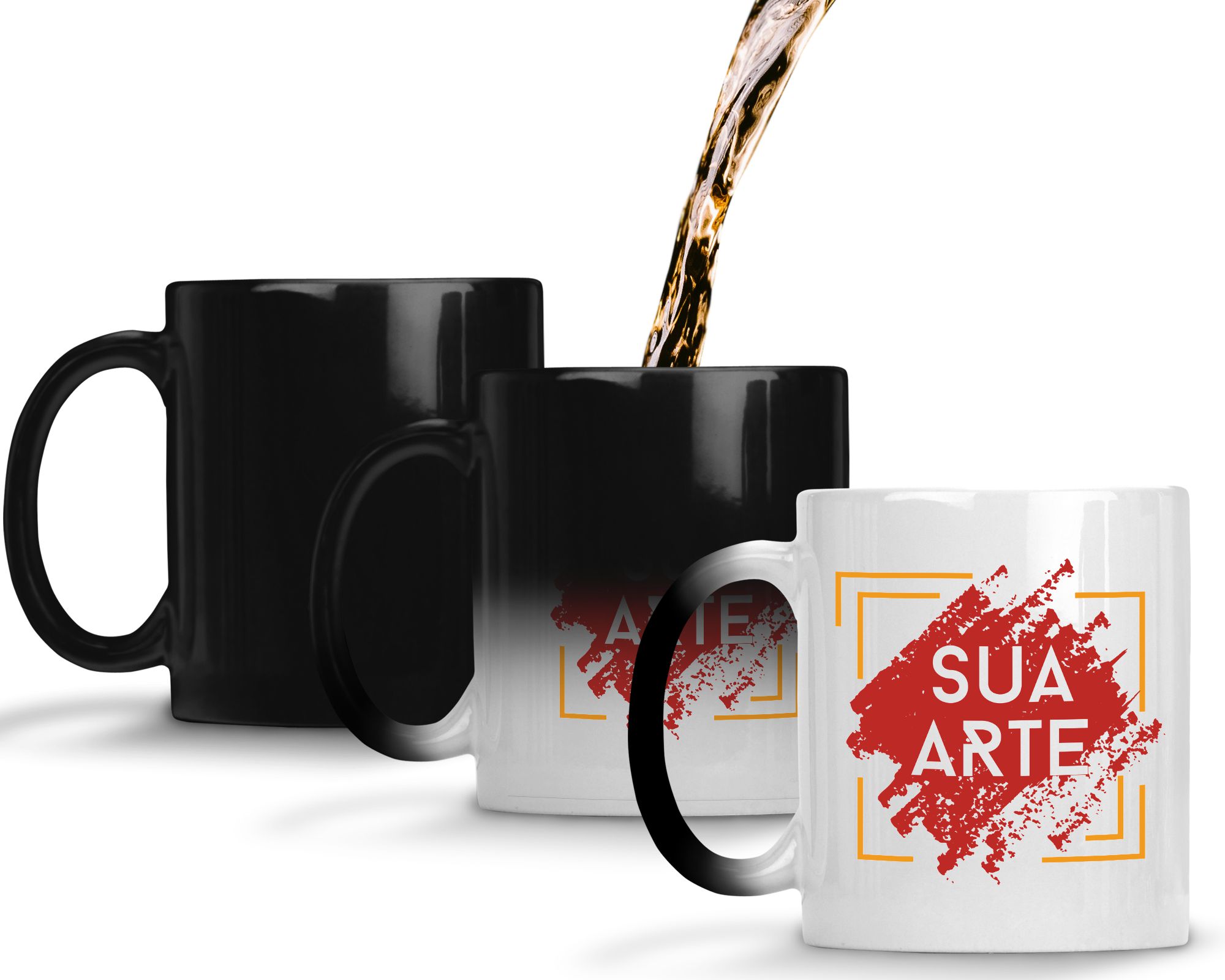 Consiste em uma caneca toda preta e quando colocamos liquido quente uma imagem oculta aparece para surpreender.